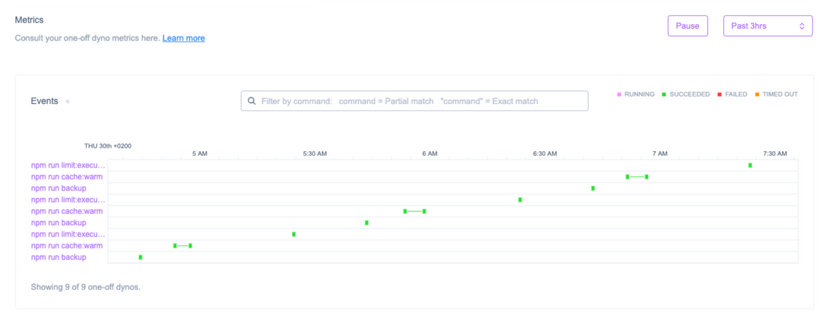 One-off Metrics is ideal for visualising and monitoring the one-off dynos that run your Heroku Scheduler jobs.